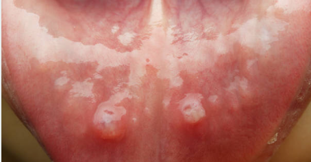 혀와 잇몸을 포함한 입안 점막 어디에나 발생한 염증 을 통틀어 구내염이라고 합니다. 구내염은 모양에 따라서 궤양성, 수포성, 미란성 세 가지로 구분할 수 있습니다. 궤양성 구내염은 점막이 헐어서 상처가 나는 형태인데, 피곤할 때 잘 생기는 아프타성 구내염이 이에 해당합니다. 수포성 구내염은 작은 물집 형태로 나타나는데, 수족구병, 천포창, 대상포진 같은 질환에서 관찰됩니다. 미란성 구내염은 점막이 벗겨지는 형태인데, 칸디다성 구내염에서 볼 수 있습니다.