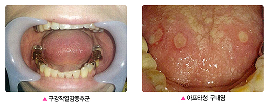 피곤할 때 흔히 나타나는 아프타성 구내염 은 면역력이 떨어지면서 발생하는데, 둥그런 반점 모양으로 점막이 헐어서 심한 통증이 발생합니다. 의치나 날카로운 치아 때문에 점막에 상처가 나거나 철분이나 비타민이 부족한 경우, 방사선 치료를 받은 후에도 구내염이 발생할 수 있습니다.