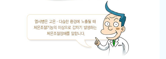열사병은 고온·다습한 환경에 노출될 때 체온 조절 기능의 이상으로 갑자기 발생하는 체온 조절 장해를 말합니다.