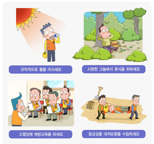 언론을 통해 무더위 관련 기상상황 매일 체크 정전 대비 손전등과 비상 식음료, 부채, 휴대용 라디오 준비 가까운 병원 연락처 확인