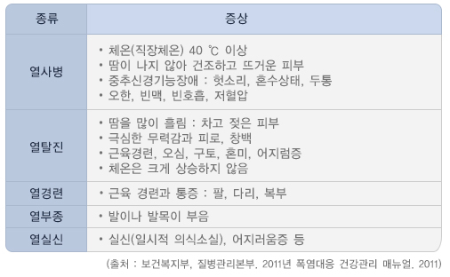 특히 기온과 관련된 질병과 사망(temperature-related illnesses and deaths)은 직접적인 기온 상승으로 인한 열중증(온열질환, heat disorders)과 기온상승에 의한 기존질환의 악화로 구분할 수 있습니다.