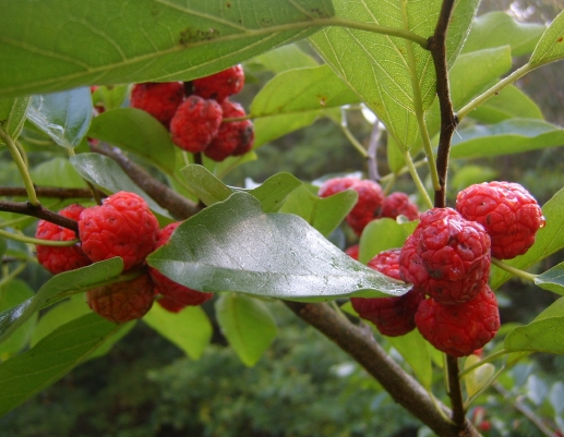 열매: 9월쯤 붉은색에서 검은색으로 익는 둥근 열매를 맺습니다. 이 열매를 꾸지뽕열매라고 하며 식용도 가능합니다.