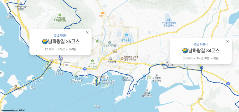 경남 사천시 신덕사거리 와룡식당 앞에서 경남 사천시 삼천포대교사거리 앞까지 10.2km 3시간30분소요 약간 쉬운걷기