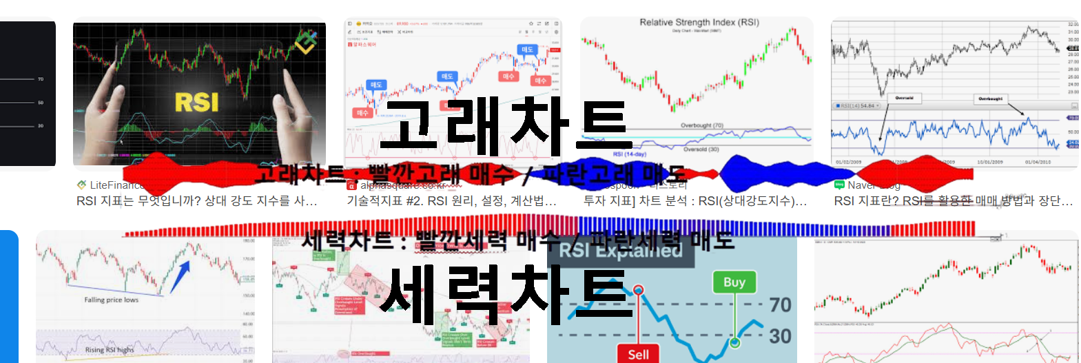 추세의 강도와 방향을 표현하는 지표로 횡보 장세에 활용하기 적합하다. 상대강도지수라고도 부른다. 상승 폭과 하락 폭을 계산해 나타낸다. 70% 이상을 과매수, 30% 이하를 과매도 구간으로 본다..