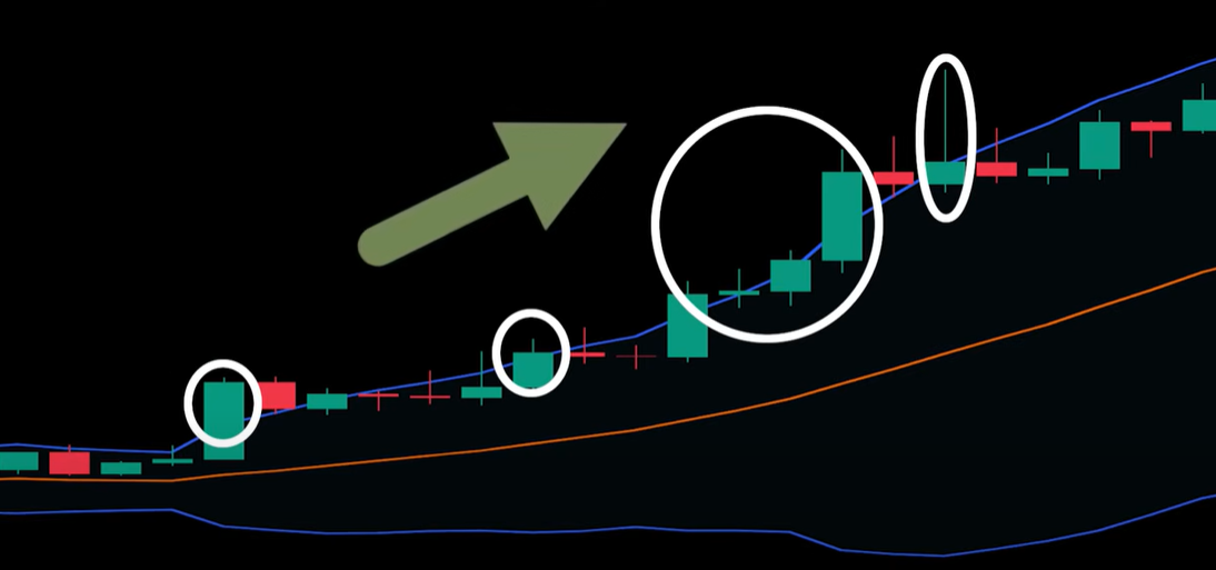 두번째는 추세 지속을 알리는 밴드타기 입니다 볼린져밴드를 활용해 추세가 지속되는지 알 수 있을까요? 가장흔히 저지르는 실수가 가격이 상단밴드를 터치하면 매도하거나 하단밴드를 터치할때 매수하는것입니다 밴드 상단과 하단에 닿는것은 하나의 기준일 뿐이지 그것자체만을 매매 시그널이 될순 없습니다