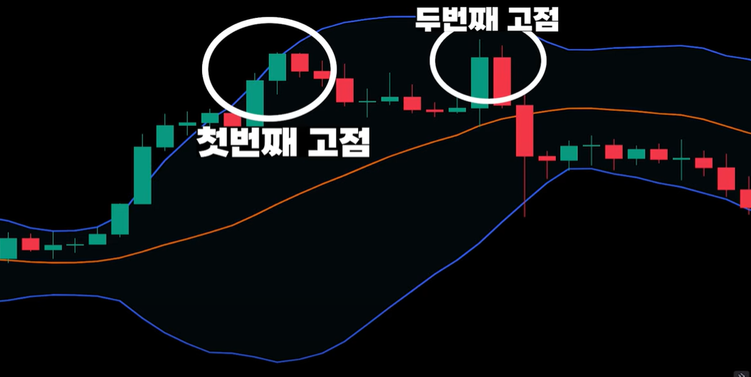 M형 패턴 이중천정형 패턴은 1차가격이 상승하고 조정구간을 거쳐 다시 2차가격 상승이 발생하고 다시 하락 추세가 발생하는 모습입니다 특히 M형 패턴은 밖에서 첫번째 고점이 나타난뒤 밴드안에서 두번째 고점이 나타나는 하락추세 반전형 패턴입니다