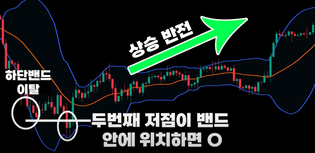 첫번째 저점이 하단밴드를 이탈하지만 두번째 저점은 하단밴드 안에 위치한다는 점이 중요합니다 즉 두번째 저점이 첫번재 저점을 하향 이탈한다고 하여도 볼린져밴드 관점으로 보면 두번째 저점이 밴드안에 위치한다면 상승 반전 패턴이 될 수 있다는 것입니다