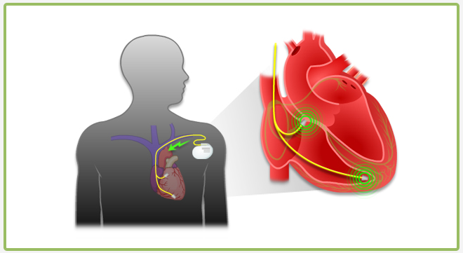 심장의 내부에 규칙적인 전기리듬을 발생시키는 박동조율기(pacemaker)를 심어서 부정맥을 치료하는 방법입니다.