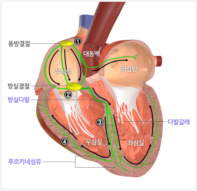 심장의 정상적인 수축에는 전기 자극이 필요합니다. 그 체계를 간략하게 보면 동방결절(sinoatrial node), 방실결절(atrioventricular node), 다발갈래(bundle branch) 순서로 구성되어 있습니다.