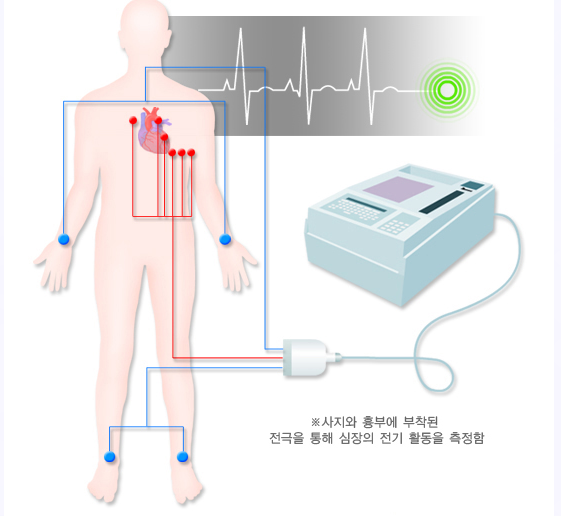 심장은 전기전달체계의 전기적 활동에 의해 박동합니다. 동방결절에서 발생한 규칙적인 전기활동은 방실결절과 다발갈래를 거쳐 심장 전체로 전달되어 심장 근육이 수축과 이완을 반복합니다. 이러한 심장의 전기적 활동은 전신으로 전달되므로 가슴과 팔, 다리에 전극을 연결해 이를 기록하면 심장의 전기적 활동 상태를 관찰할 수 있습니다. 이것이 바로 심전도 검사입니다. 정상인에서 심전도는 일정한 파형을 그립니다. 그러나 부정맥이 생기면 심전도의 모양이나 리듬이 변하므로 이것을 판독해 부정맥의 존재와 종류, 원인까지도 확인할 수 있습니다.