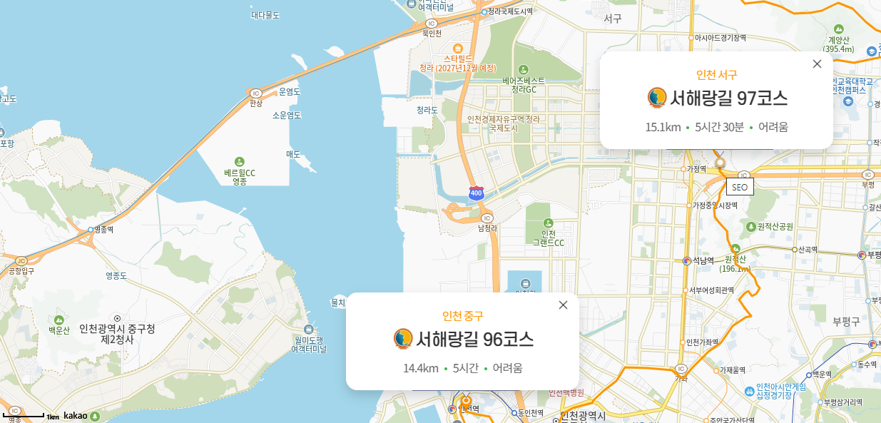 - 아라뱃길을 건너 인천과 김포를 잇는 낮은 산의 능선을 잇는 코스