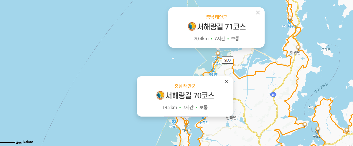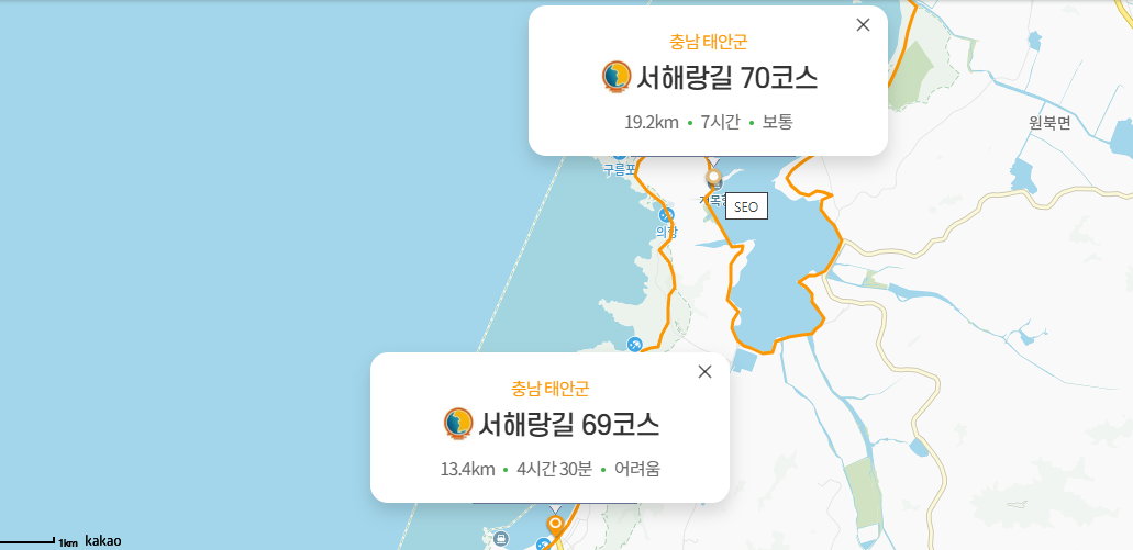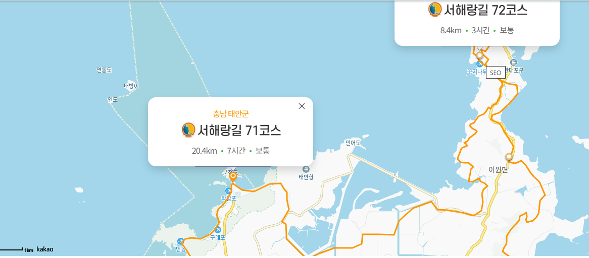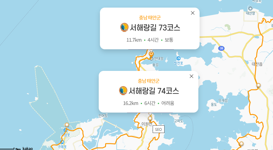 - 서해안 3대 해소욕장으로 유명한 만리포해변으로 이어지는 바다와 갯벌, 아름다운 낙조를 볼 수 있는 코스