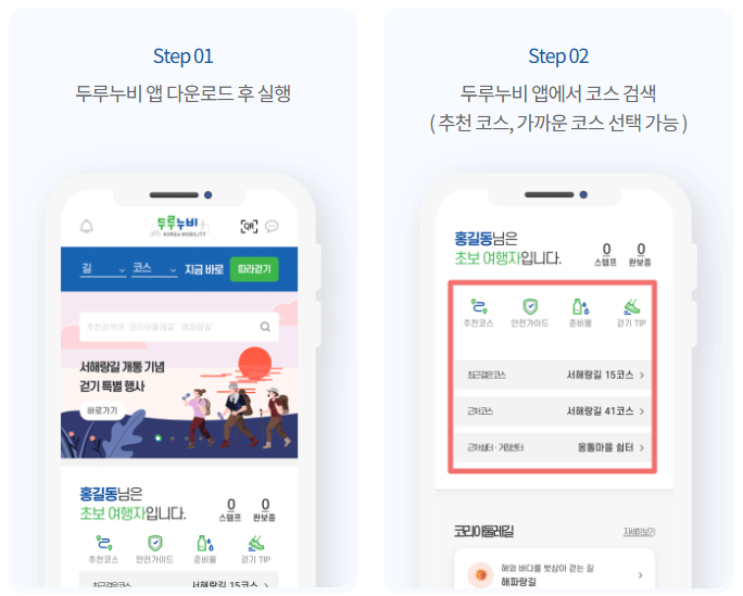 여행 전 본 홈페이지와 두루누비 앱을 이용하여 각 코스 정보(난이도, 위치, 교통편 등)와 여행 후기를 확인합니다.