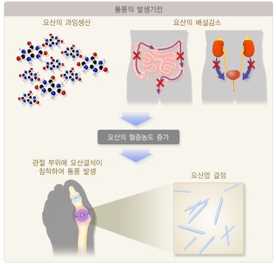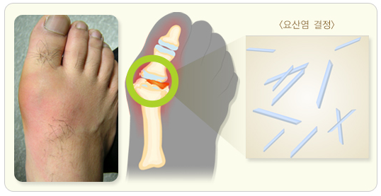 통풍은 혈액 내에 요산의 농도가 높아지면서 이로 인해 발생한 요산염 결정이 관절의 연골, 힘줄 등 조직에 침착되는 질병입니다. 침착된 결정은 관절의 염증을 유발하고 극심한 통증을 동반합니다.