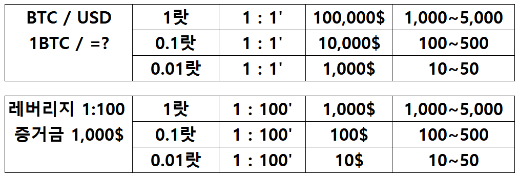 계약 단위(Lot): FX에서 거래 단위로 1 계약(Lot)은 기준 통화 × 100,000의 가치를 가집니다. 예를 들어 USD/JPY 1 Lot은 100,000 달러를 거래하는 것입니다.