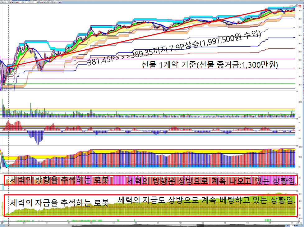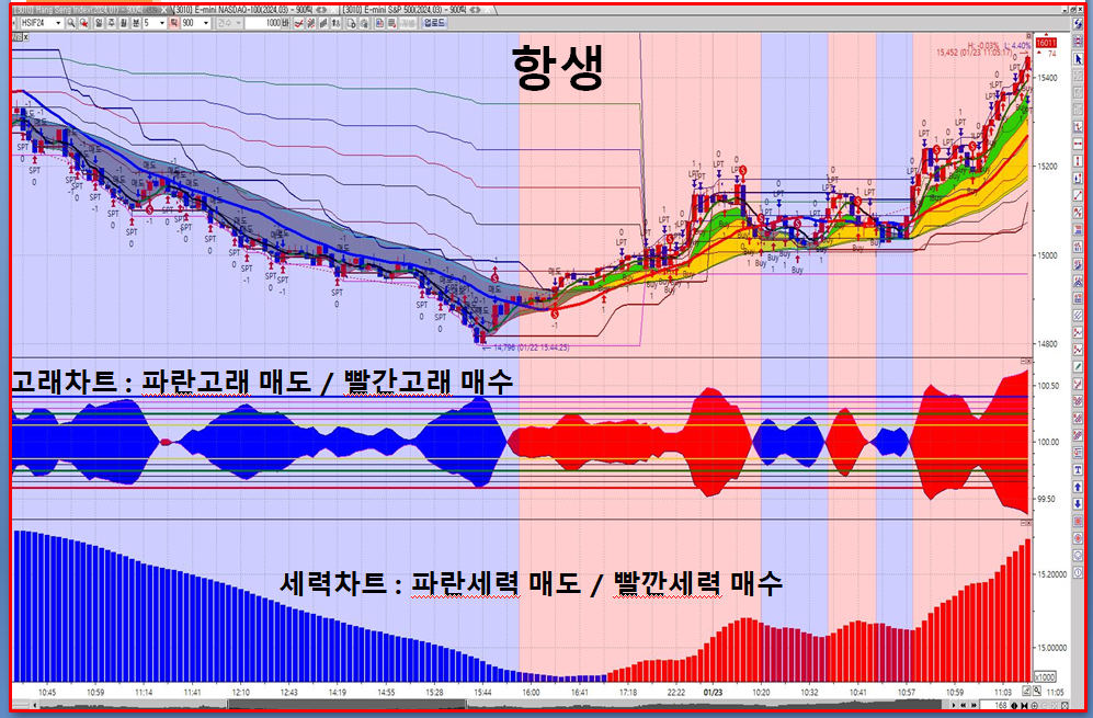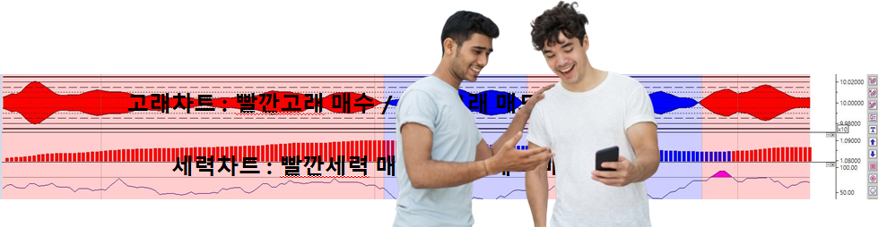 방법은 이렇습니다 고래와세력은 다섯가지의 세력 층을 한가지의 색으로 만들어 누구나 거래가 가능하도록 만들었습니다 파란고래가 나오면 하방 sell 방향으로 빨간 고래세력은 상방 buy 방향으로 진행되는 것입니다 누구나 주식을 몰라도 선물을 몰라고 색갈 구분만 할줄 아시면 거래가 가능합니다 그래도 힘이 드신다고요? 몇시간씩 화면 바라보고 있는게 힘이 들지요 당연합니다
